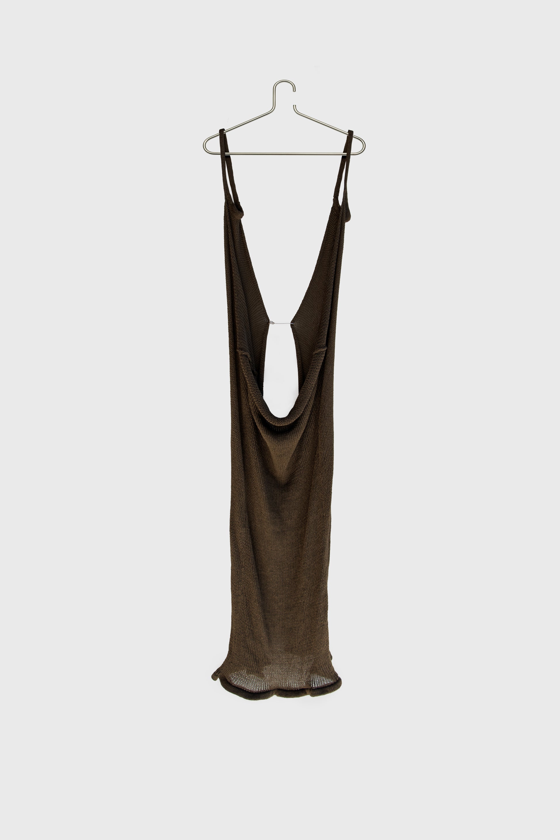 Ankle-length knitwear dress in rich Moss Green. Handcrafted in 100% cotton with a crossover construction that wraps and drapes across the body. Features open-knit paneling throughout, offering a semi-sheer texture that plays with light and layering.